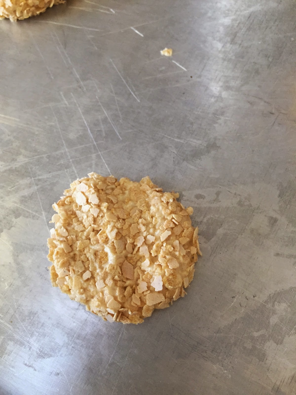 - Coat each balls with nestum. Flatten it into 0.8cm thick and lay them on baking trays. The cookies will spread so please given sufficient space in between them.